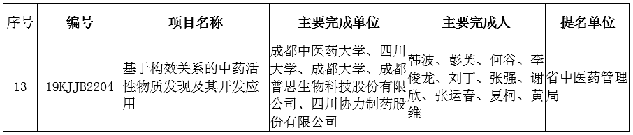由四川省中醫(yī)藥局提名,我司作為主要完成單位之一申報的“基于構(gòu)效關(guān)系的中藥活性物質(zhì)發(fā)現(xiàn)及其開發(fā)應(yīng)用”項目獲四川省科學(xué)技術(shù)進步獎(科技進步類)一等獎,公司董事長兼總經(jīng)理劉丁先生、原副總經(jīng)理夏柯先生是項目的主要完成人。項目的主要完成單位還有成都中醫(yī)藥大學(xué)、四川大學(xué)、成都大學(xué)和四川協(xié)力制藥股份有限公司。