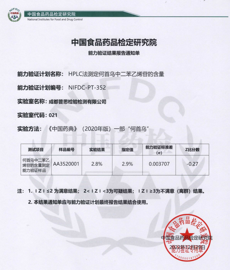 近日,成都普思生物科技股份有限公司旗下子公司“成都普思檢驗檢測有公司”通過了由中檢院于2022年組織的“麥冬等藥材顯微鑒別能力驗證項目”、“HPLC法測定何首烏中二苯乙烯苷的含量”兩項能力驗證,結果均為“滿意”。