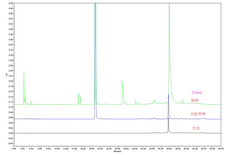 制備液相優(yōu)化:選用內(nèi)徑150mm系統(tǒng),梯度洗脫結(jié)合動(dòng)態(tài)軸向壓縮柱技術(shù),單批次處理量達(dá)50g原料,獲得目標(biāo)成分120g,純度99.2%(HPLC圖譜見(jiàn)下圖)原料及單體分離圖譜: