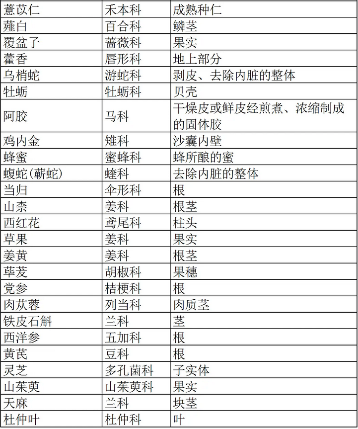 人參、人參葉、人參果、三七、土茯苓、大薊、女貞子、山茱萸、川牛膝、川貝母、川芎、馬鹿胎、馬鹿茸、馬鹿骨、丹參、五加皮、五味子、升麻、天門冬、天麻、太子參、巴戟天、木香、木賊、牛蒡子、牛蒡根、車前子、車前草、北沙參、平貝母、玄參、生地黃、生何首烏、白及、白術(shù)、白芍、白豆蔻、石決明、石斛、地骨皮、當(dāng)歸、竹茹、紅花、紅景天、西洋參、吳茱萸、懷牛膝、杜仲、杜仲葉、沙苑子、牡丹皮、蘆薈、蒼術(shù)、補骨脂、訶子、赤芍、遠志、麥冬、龜甲、佩蘭、側(cè)柏葉、制大黃、制何首烏、刺五加、刺玫果、澤蘭、澤瀉、玫瑰花、玫瑰茄、知母、羅布麻、苦丁茶、金蕎麥、金纓子、青皮、厚樸花、姜黃、枳殼、枳實、柏子仁、珍珠、絞股藍、胡蘆巴、茜草、蓽茇、韭菜子、首烏藤、香附、骨碎補、黨參、桑白皮、桑枝、浙貝母、益母草、積雪草、淫羊藿、菟絲子、野菊花、銀杏葉、黃芪、湖北貝母、番瀉葉、蛤蚧、越橘、槐實、蒲黃、蒺藜、蜂膠、酸角、墨旱蓮、熟大黃、熟地黃、鱉甲