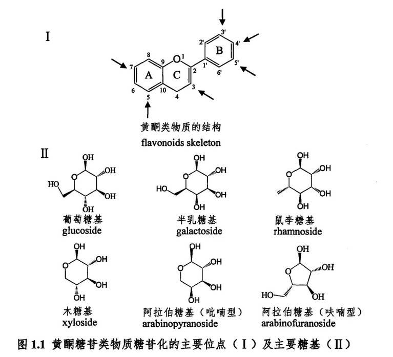 黃酮糖苷主要是由黃酮基本骨架主要位置上的氧化作用所形成的。糖取代基多以氫氧化形式與黃酮碳骨架相連,形成O-糖苷,也有少數(shù)與黃酮A環(huán)上的C原子直接相連形成C-糖苷,如牡荊素、葛根素等。糖基主要包括葡萄糖、半乳糖、鼠李糖、木糖、阿拉伯糖等,且部分糖基有乙酰化、咖啡?;?、香豆酰化、沒食子酰化等現(xiàn)象。