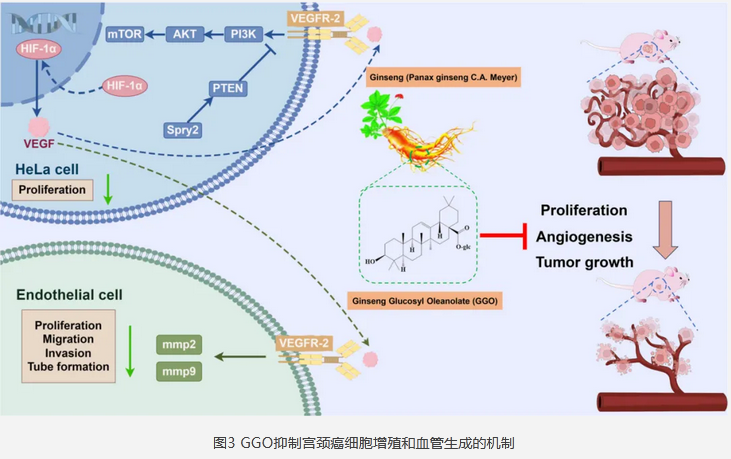 研究者通過酶轉(zhuǎn)化將人參皂苷Ro轉(zhuǎn)化為人參葡萄糖基齊墩果酸(GGO),通過抑制PI3K/AKT/HIF-1α信號通路,減少HIF-1α的核轉(zhuǎn)位和VEGF的表達,從而抑制宮頸癌細胞的增殖和血管生成。[10]